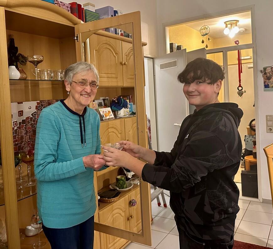 Ehrenamtliche der Taschengeldbörse Münster vermitteln Jugendliche zwischen 13 und 17 Jahren an ältere Menschen, die gelegentlich Hilfe bei kleineren und ungefährlichen Tätigkeiten in Haus und Garten benötigen. So haben auch Theo (14) und Elisabeth (75) zusammengefunden. Theo hatte sich bei der Taschengeldbörse angemeldet, um sich neben der Schule ein kleines Taschengeld hinzuzuverdienen. Elisabeth suchte über die Taschengeldbörse jemanden, der ihr u.a. im Garten das Laub zusammenharkt.