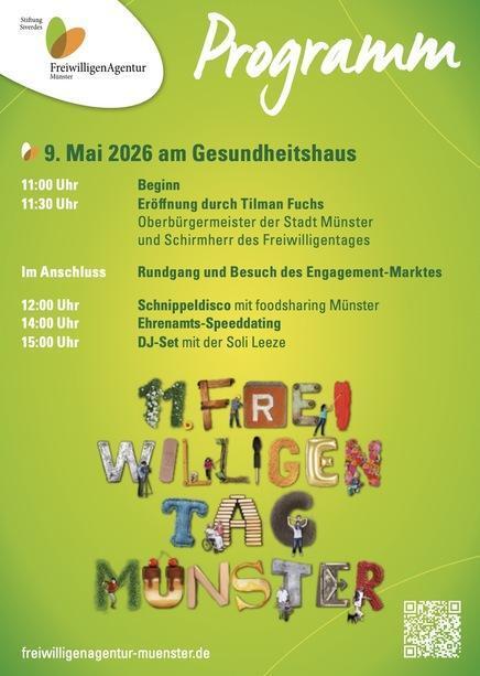 Am 9. Mai findet der 11. FreiwilligenTag der FreiwilligenAgentur Münster rund um das Gesundheitshaus statt. Mehr als 40 gemeinnützige Organisationen aus den Bereichen Soziales und Bildung, Inklusion, Nachhaltigkeit, Migration und Integration, Demokratie und Menschenrechte, Rettungsdienste, Tierschutz und Brauchtum stellen die Möglichkeiten, sich bei ihnen ehrenamtlich zu engagieren, vor. Auch ein Team von "Von Mensch zu Mensch" ist mit einem Infostand vertreten und freut sich auf Ihren Besuch!